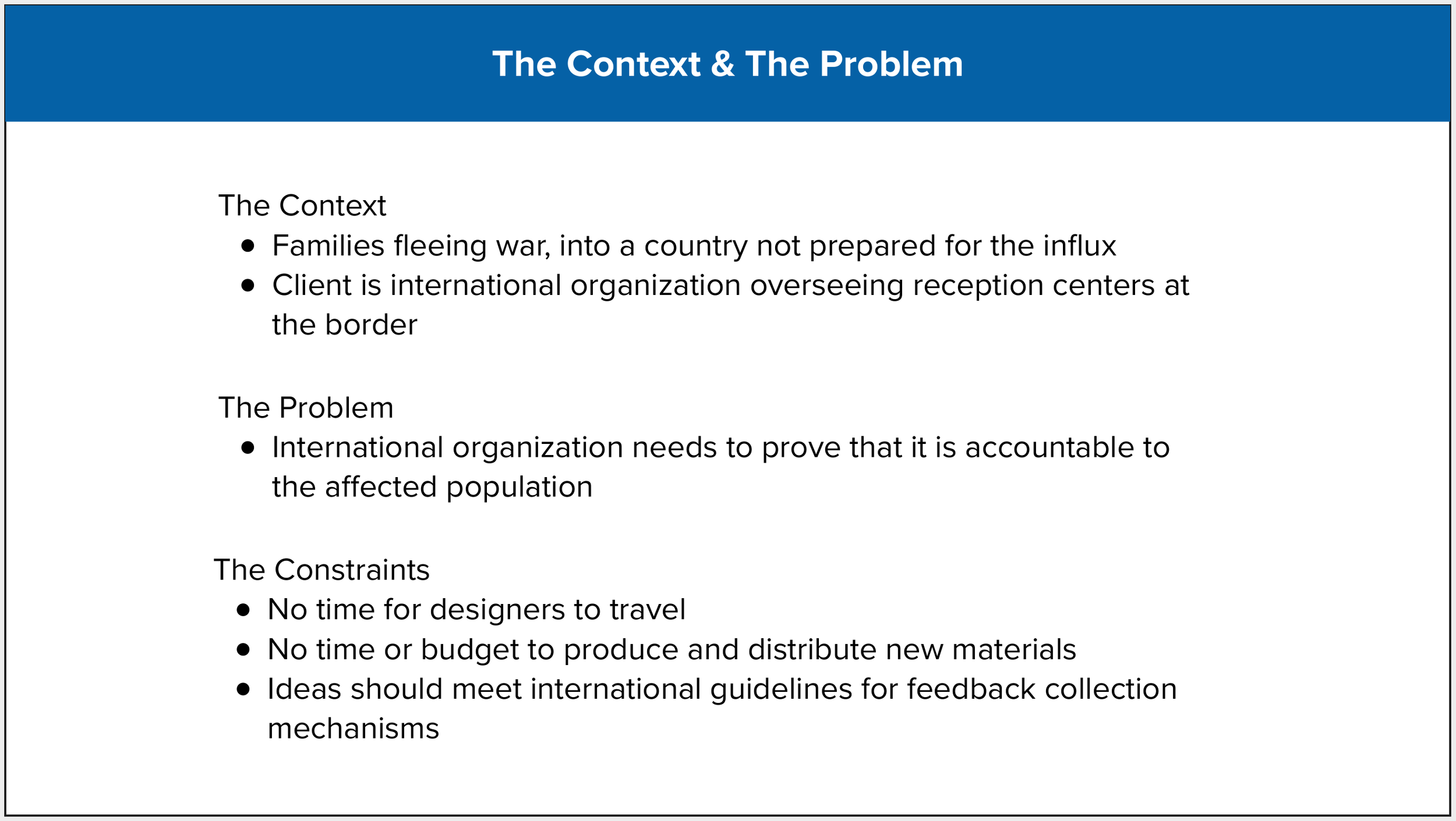 Project: When the client needed a feedback collection mechanism in a low-resource environment Slide 1 Slide 1 (current slide) Slide 2 Slide 2 (current slide) Slide 3 Slide 3 (current slide) Slide 4 Slide 4 (current slide)